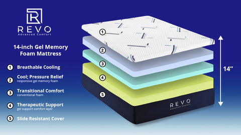 - Better Rest with Advanced Gel Memory Foam Technology: Stay cool and comfortable with the Revo Sleep Cooling Gel Memory Foam Mattress. Our collection of gel memory foam mattresses is designed with advanced cooling and contouring foam layers to help regulate your body temperature and provide exceptional pressure relief so you wake up refreshed and ready to take on the day.
